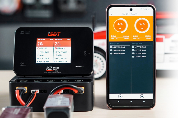 The high-performance dual-channel charger ISDT K2 ZIP 2x500W is an intelligent charger with power from the mains and car battery and very simple and clear operation. K2 ZIP allows you to charge and discharge common types of cells (NiCd, NiMH, LiPo, LiHV, ULiHV, Li-ion, LiFe, Pb), in addition, it is equipped with built-in eight-channel balancers that ensure safe charging of lithium batteries. The charger is equipped with a color LCD display and programming buttons that provide you with the possibility of comfortable and very clear parameter settings, control and monitoring of the charging/discharging process.
