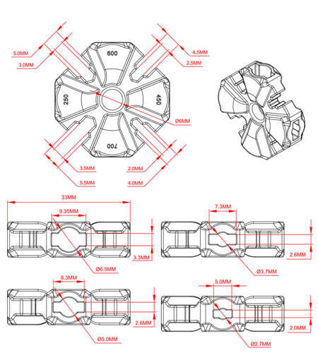 Klucz do wkręcania snapów multifunkcyjny. Pasuje do modelu helikoptera 250-700. Pasuje do 8 rodzajów średnic (2,0/2,5/3,0/3,5/4,0/4,5/5,0/5,5 mm) popychacza oraz czterech szerokości (5,0/7,3/8,3/9,35 mm) snapów. Może znacznie skrócić czas potrzebny na montaż lub naprawę.