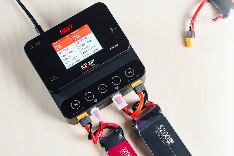 Wysokowydajna ładowarka dwukanałowa ISDT K2 ZIP 2x500W to inteligentna ładowarka zasilana z sieci i akumulatora samochodowego, charakteryzująca się wyjątkowo prostą i przejrzystą obsługą. Ładowarka K2 ZIP umożliwia ładowanie i rozładowywanie powszechnie stosowanych typów ogniw (NiCd, NiMH, LiPo, LiHV, ULiHV, Li-ion, LiFe, Pb). Wyposażona jest we wbudowane ośmiokanałowe balansery, które gwarantują bezpieczne ładowanie akumulatorów litowych. Ładowarkę wyposażono w kolorowy wyświetlacz LCD oraz przyciski programowania, które zapewnią Ci możliwość wygodnego i bardzo przejrzystego ustawiania parametrów, sterowania i monitorowania procesu ładowania/rozładowywania.